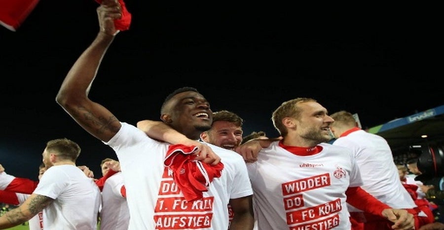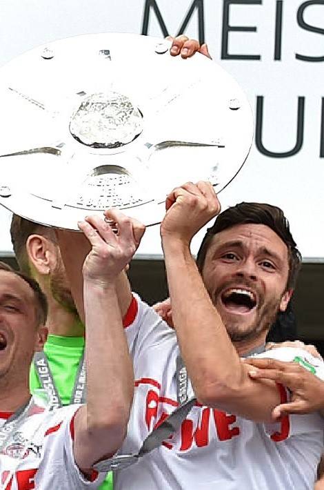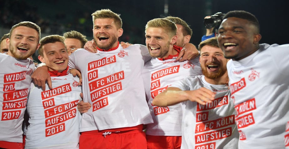 Überglücklich streiften sich die Bundesliga-Rückkehrer des 1. FC Köln ihrer Aufsteiger-T-Shirts über und jubelten vor ihren auf den Rasen gelaufenen Fans.