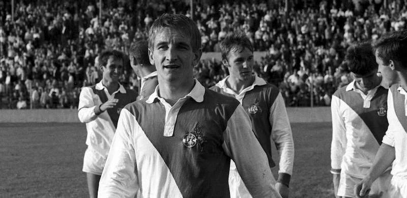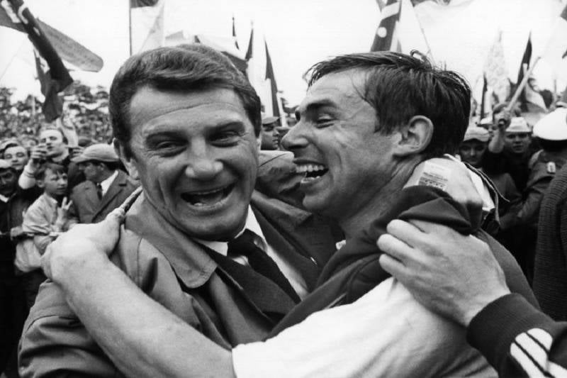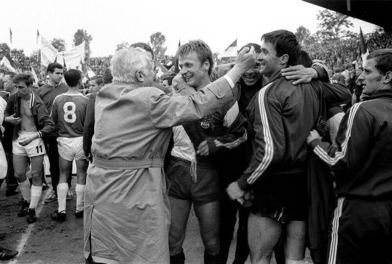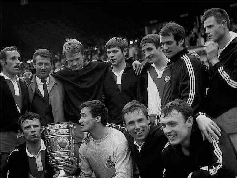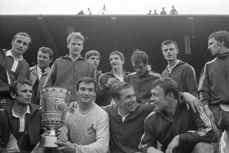 Hans Schäfer freut sich mit Fritz Pott uber den Pokalsieg