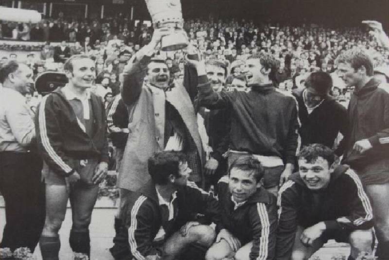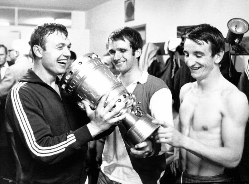 In der kabine : Rühl mit dem Pokal mit Overath und Löhr