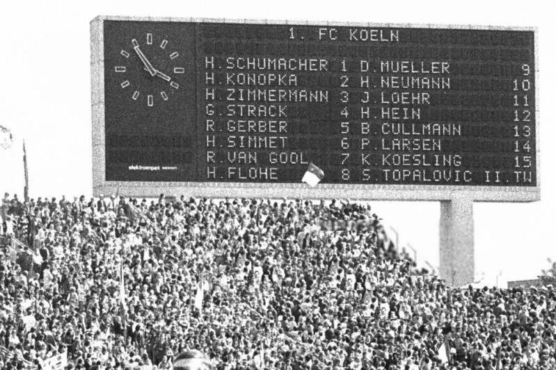 Heinz Simmet im zweikampf , dahinter Wolfgang Overath , im Hintergrund die Anzeigetafel mit unseren 1-0 Führung