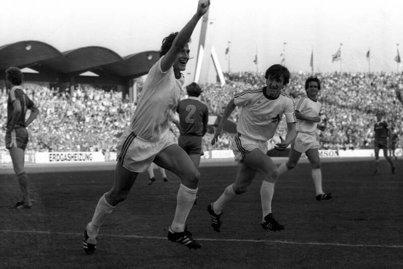 Der uberglucklicher Torschutze Dieter Müller , daneben Gerd Strack