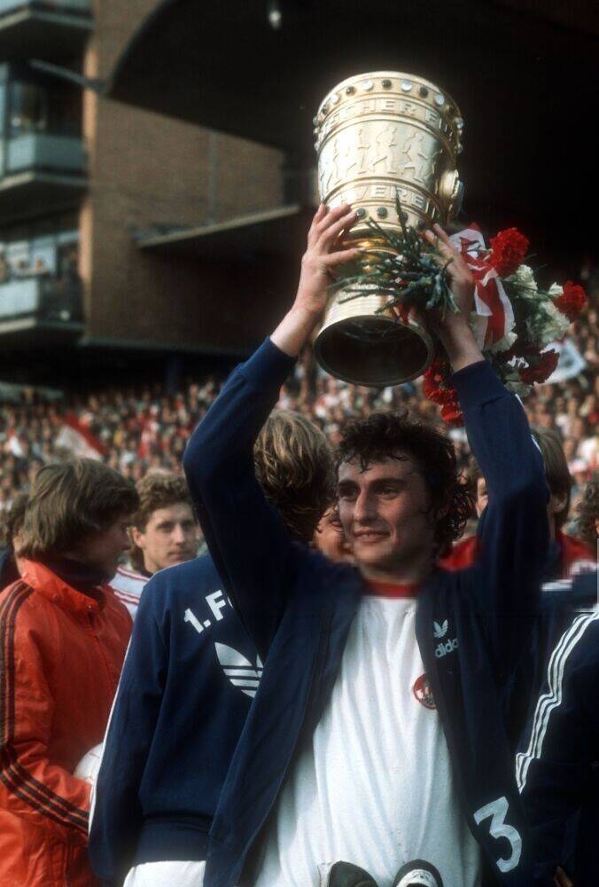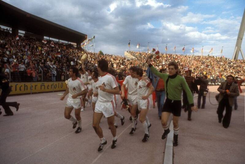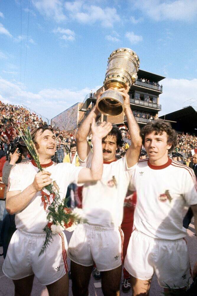 Torschutze Dieter Müller mit dem Pokal , dahinter Neumann - Topalovic - Geber