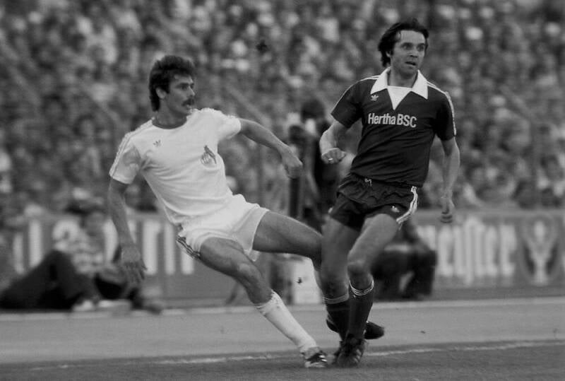 Vlnr : Preben Elkjaer Larsen - Herbert Neumann - Roland Gerber - Harald Konopka - Heinz Simmet - Johannes Löhr uberreicht denn Pokal an Dieter Müller