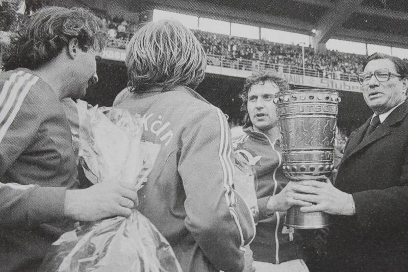 Vlnr : Roland Gerber - Heinz Flohe mit dem Pokal