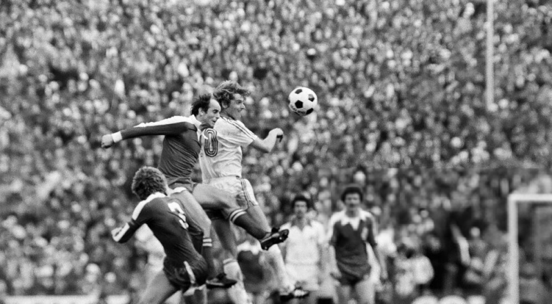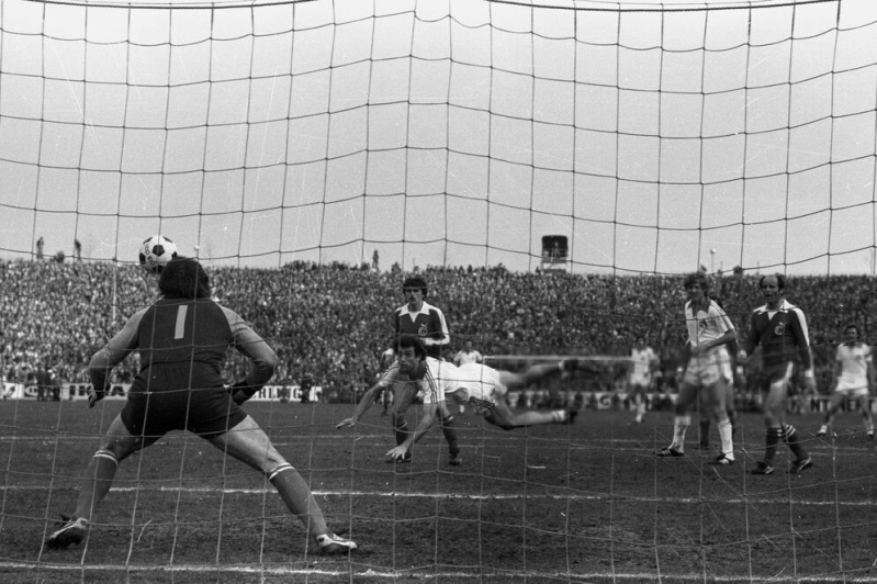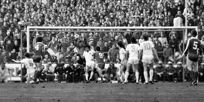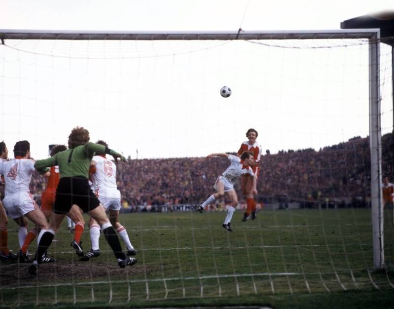 Und noch mal Dieter Müller mit ein kopfballversuch , dahinter Heinz Flohe