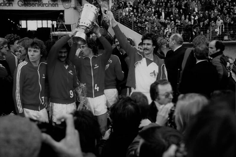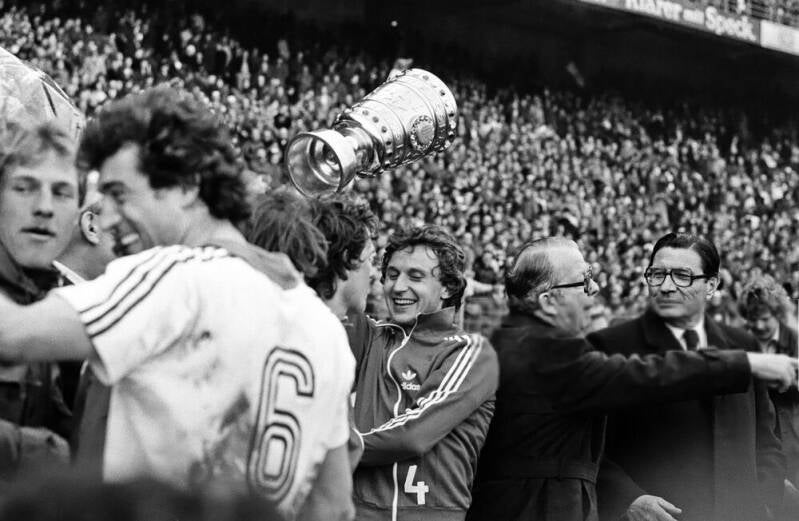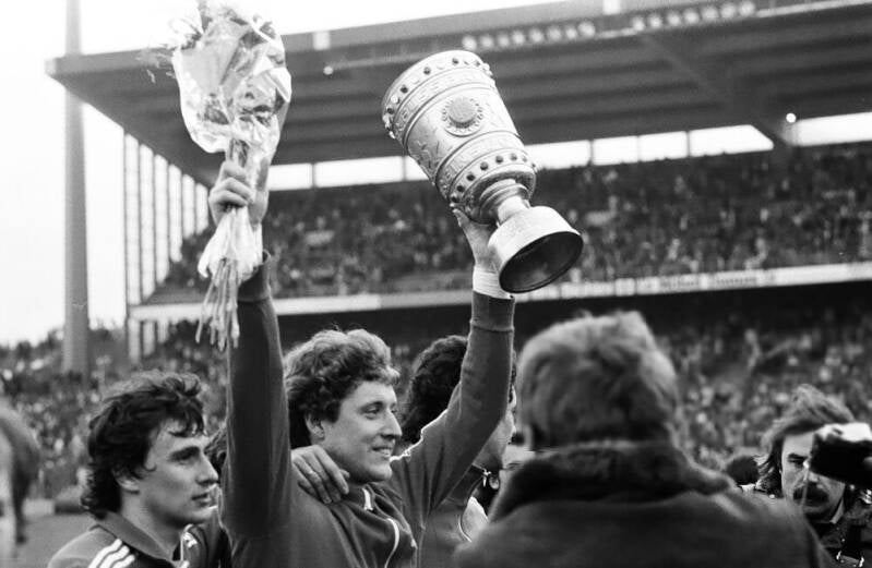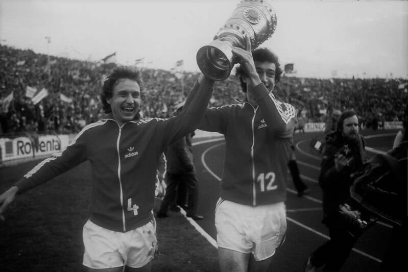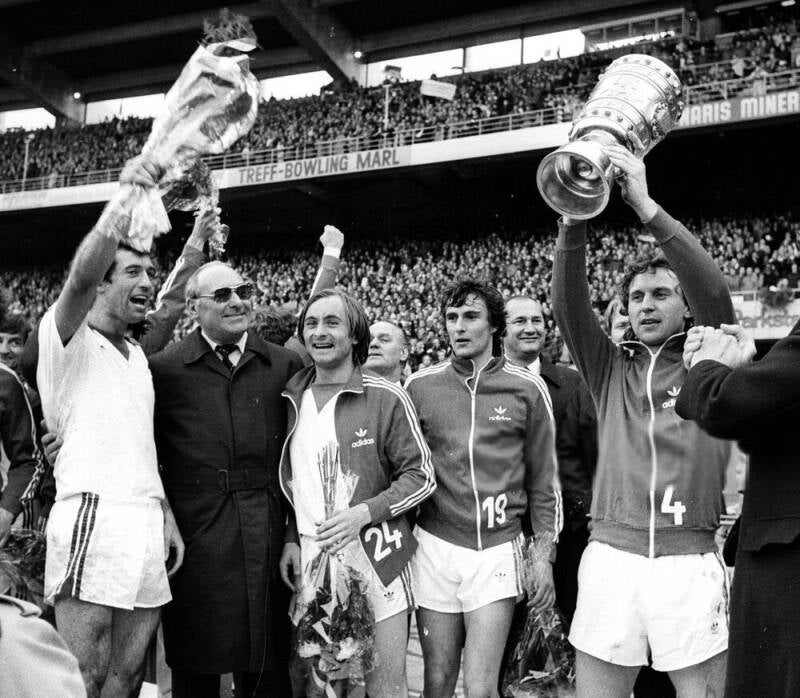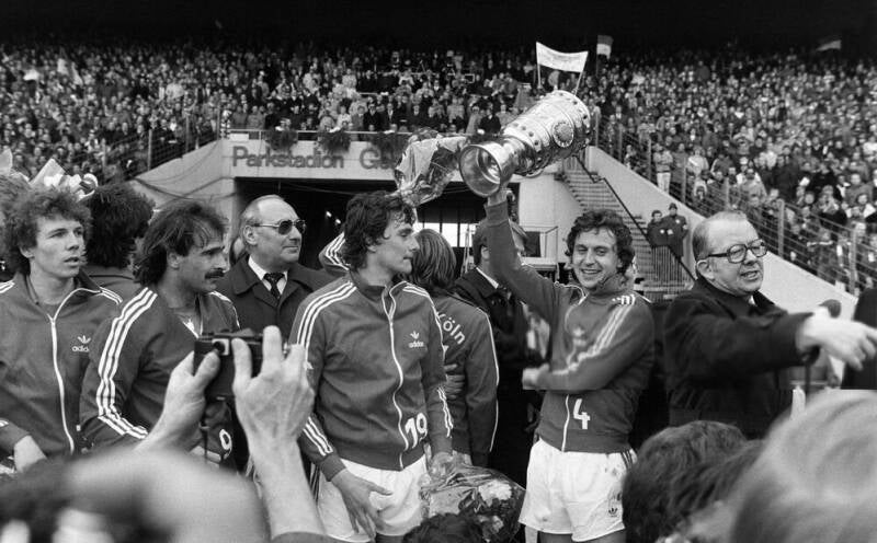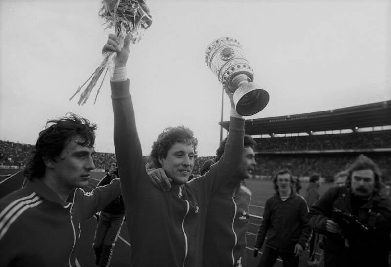 Harald "Toni" Schumacher mit dem Pokal daneben Gerd Strack