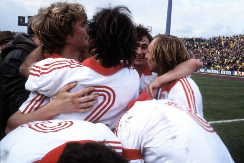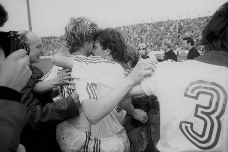 der Jubelender Torschutze Bernd Cullmann , links daneben Dieter Müller und der anlaufder Roger van Gool