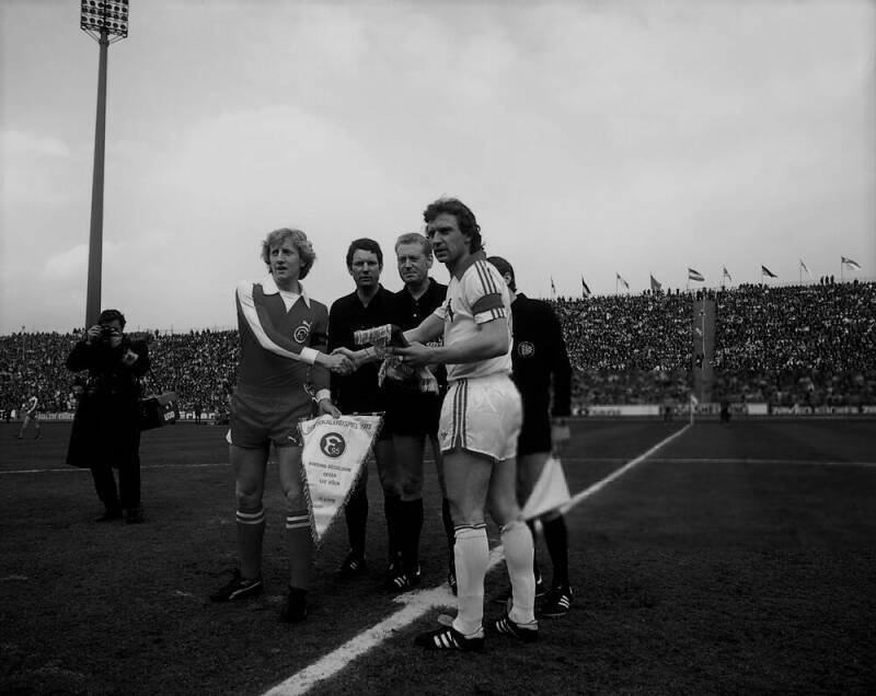 Bernd Cullmann und Harald "Toni" Schumacher schauen denn ball hinterher und geht vorbei