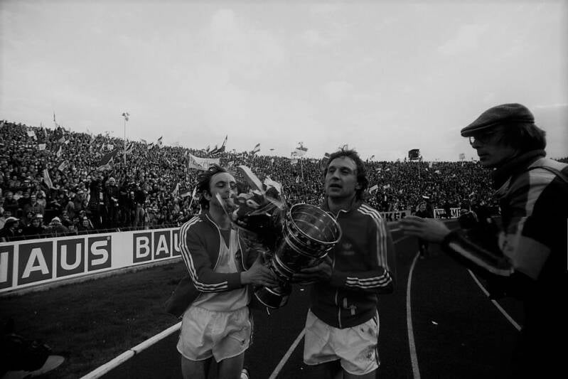 Roger van Gool und Heinz Flohe zusammen mit dem Pokal
