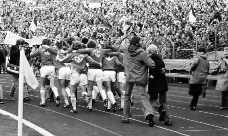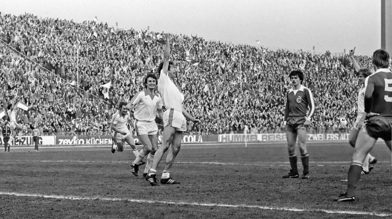 der Jubelender Torschutze Bernd Cullmann , links daneben Dieter Müller