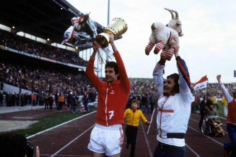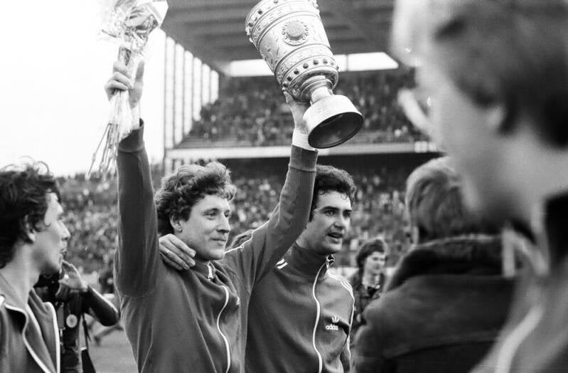 Heinz Flohe und Dieter Müller mit dem Pokal
