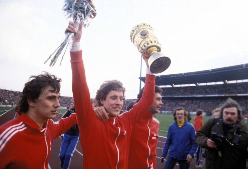 Dieter Müller - Harald "Toni" Schumacher mit dem Pokal und Gerd Strack