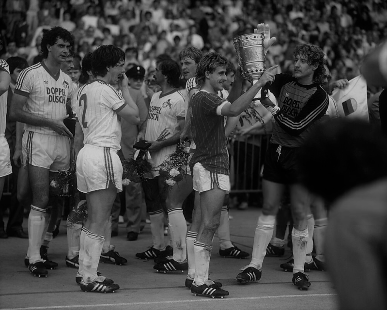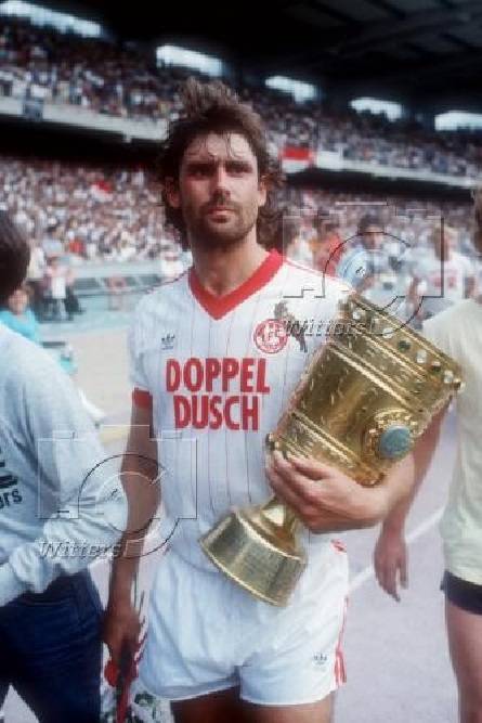 Littbarski und Gerd Strack mit dem Pokal , dahinter Harald Konopka