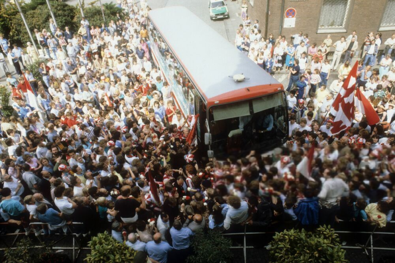 Vlnr : Allofs - Littbarski - Engels mit dem Pokal - Steiner (dahinter) - Prestin - Neumann - Fischer - Zimmermann