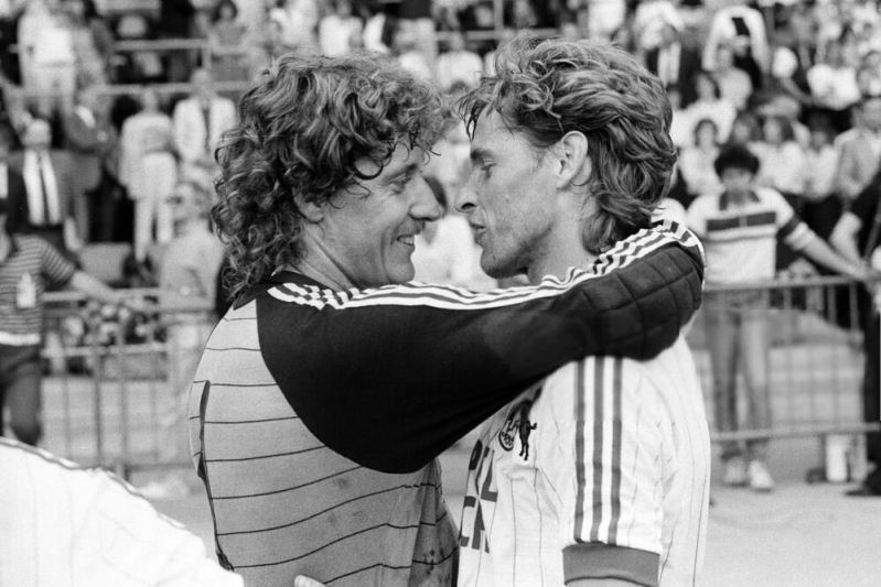 Ein Glücklicher Harald Konopka und Harald "Toni" Schumacher , dahinter Stephan Engels