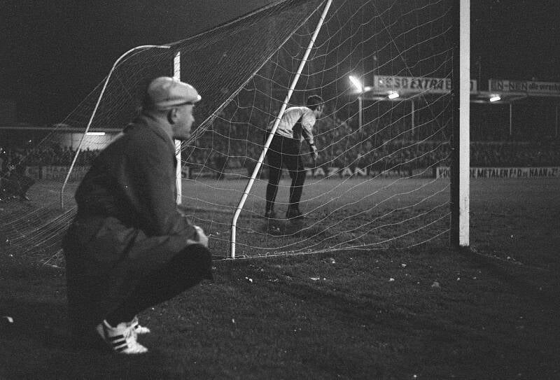 Hans Merkle im Jahr 1968 hinter das Tor von Paul Heyeres