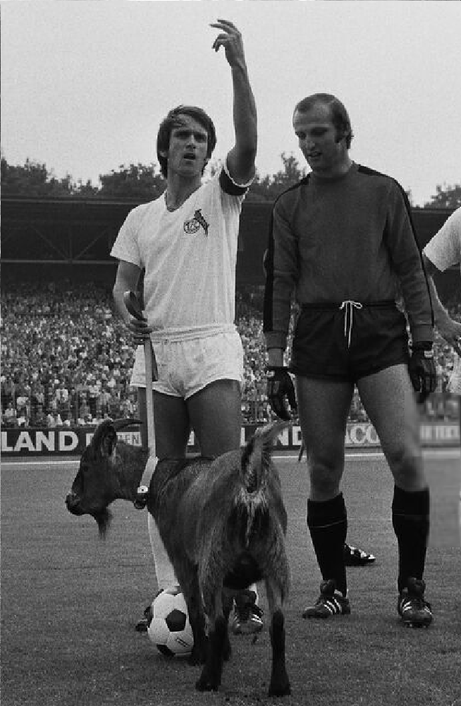 Manfred Manglitz im Jahr 1970 mit Wolfgang Overath - Karl-Heinz Thielen und Geissbock ,,Hennes III"