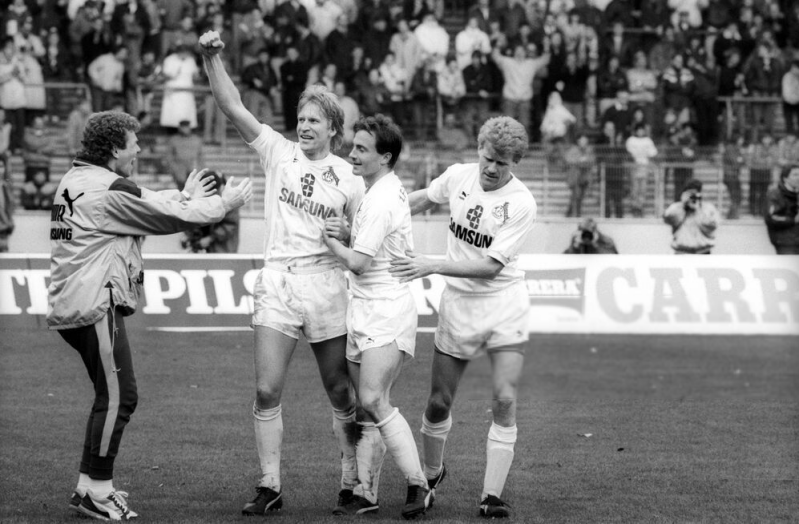 Vlnr. : Dariusz Dziekanowski - Reinhard Stumpf - Trainer Morten Olsen - Bjarne Goldbaek - Wolfgang Rolff