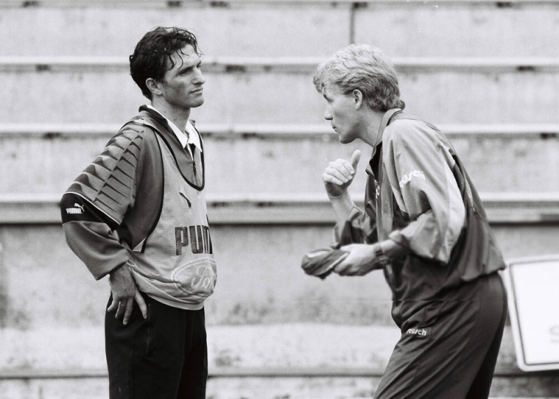 Morten Olsen als Trainer im Jahr 1994 zusammen mit Bruno Labbadia