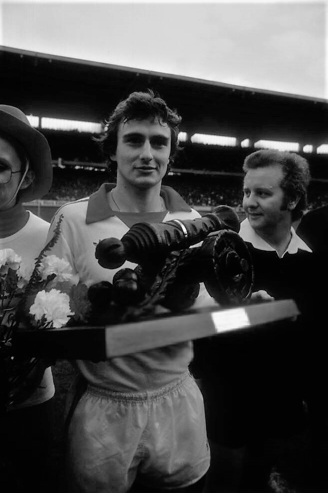 Auszeichnung als Torschützenkönig der EM 1976 (4 Tore) mit Schauspieler Jean-Paul Belmondo