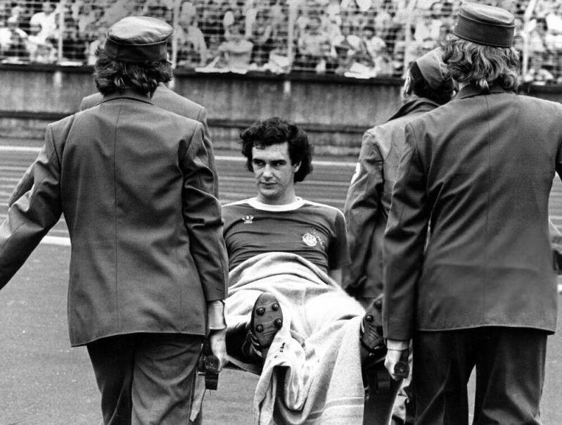 Verletzung von Gerd Strack im Jahr 1978 , unterstützt von Heinz Flohe und Heinz Simmet