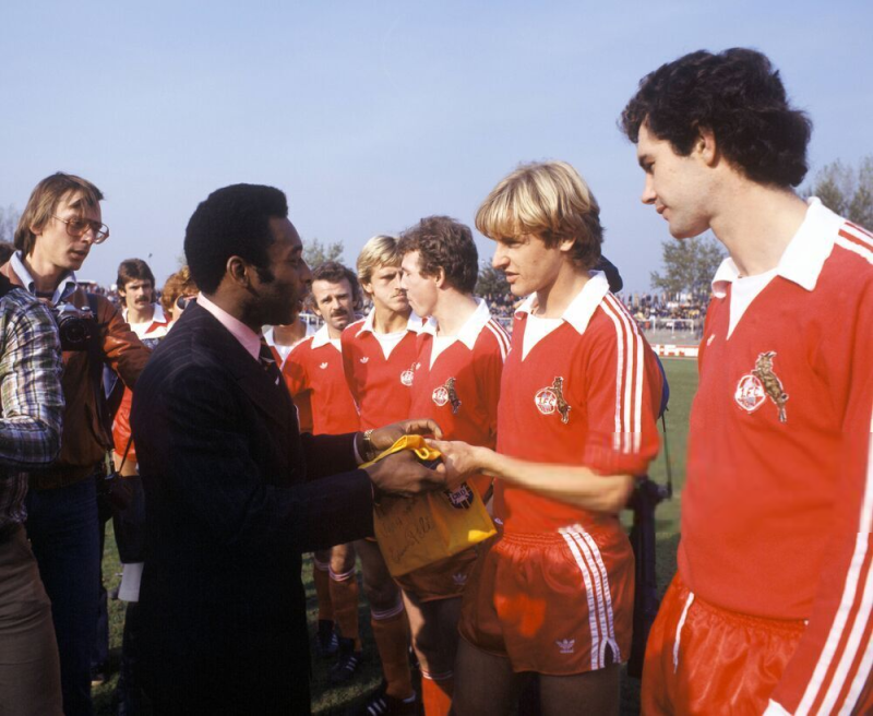 Gerd Strack im Jahr 1977 , mit Weltstar Pele , vlnr : Zimmermann , Pele , Simmet , Hein , Gerber , Neumann und Strack