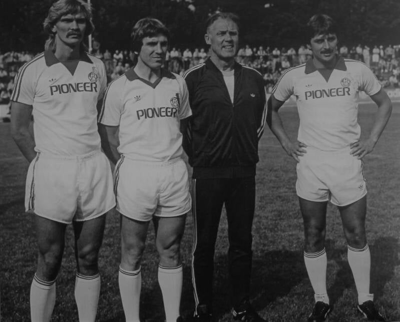 Vlnr. : Paul Steiner - Klaus Fischer - Trainer Rinus Michels - Klaus Allofs
