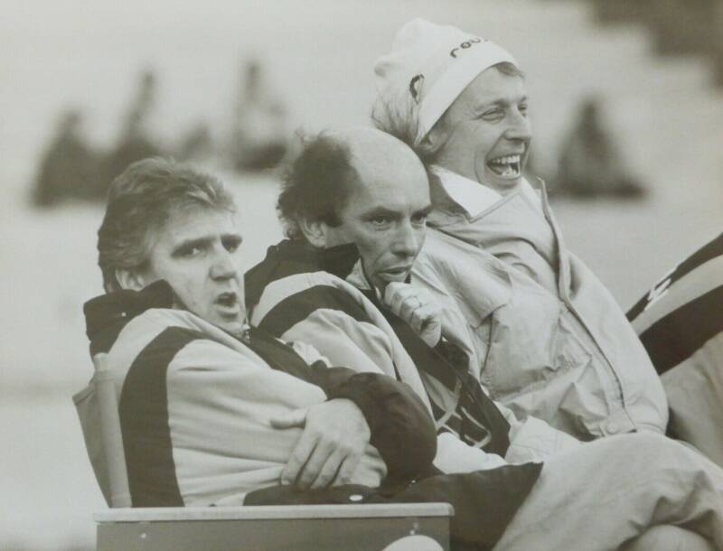 Trainer Jörg Berger im Jahr 1991 zusammen mit Co-Trainer Hannes Linssen und Rolf Herings