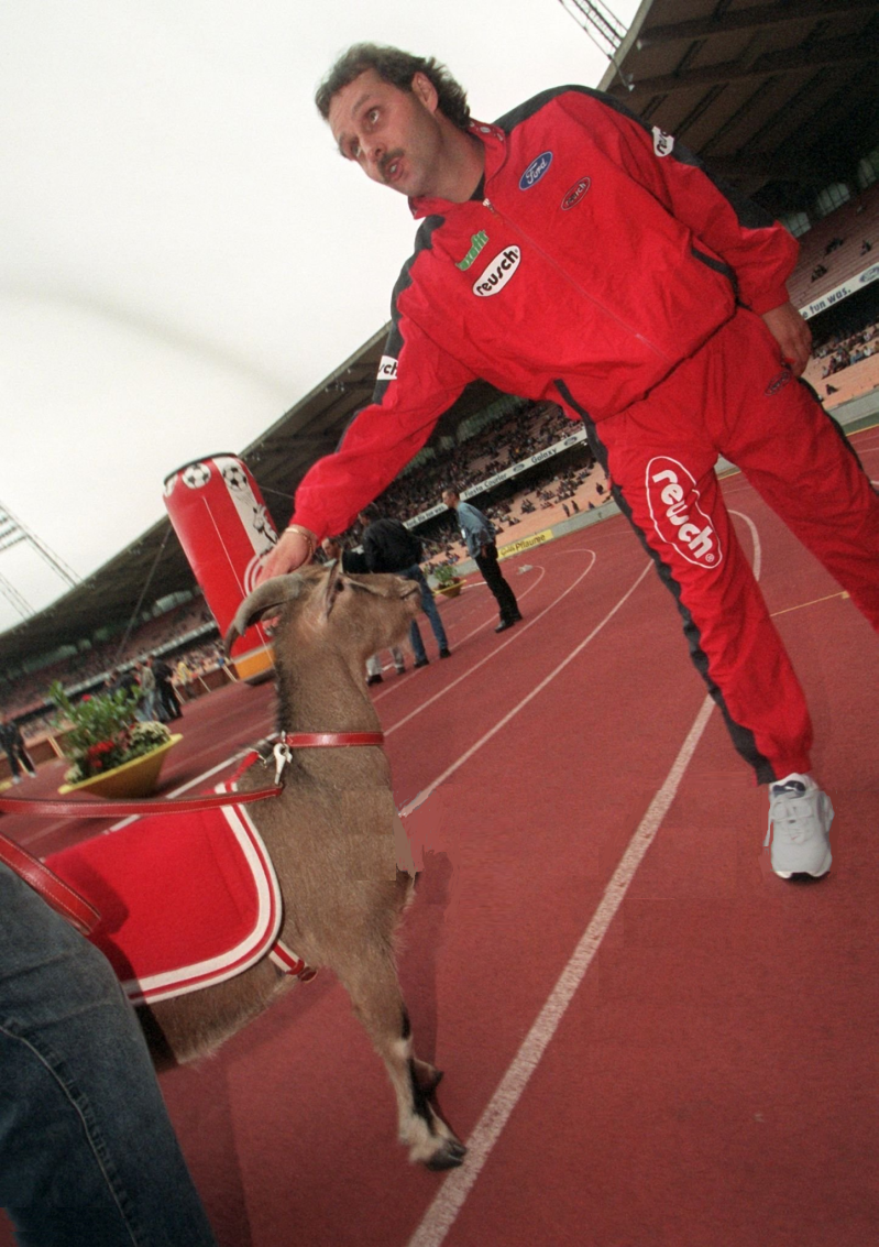 Trainer Peter Neururer im Jahr 1997 zusammen mit Geissbock ,,Hennes VII"