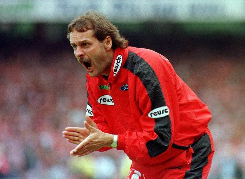Trainer Peter Neururer im Jahr 1996 zusammen mit Uwe Scherr