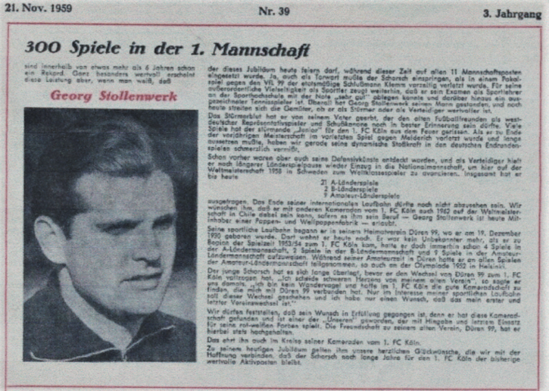 und für damalige Verhältnisse überdurchschnittlich technisch beschlagene Stollenwerk beim 1. FC Köln erst nach dem Weltmeisterschaftsturnier 1958 in Schweden.