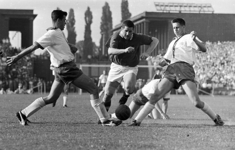 Helmut Rahn im Jahr 1959 , dahinter Karl-Heinz Schnellinger und Franz Brungs