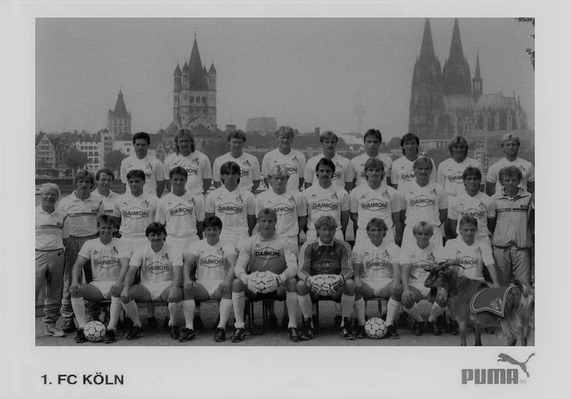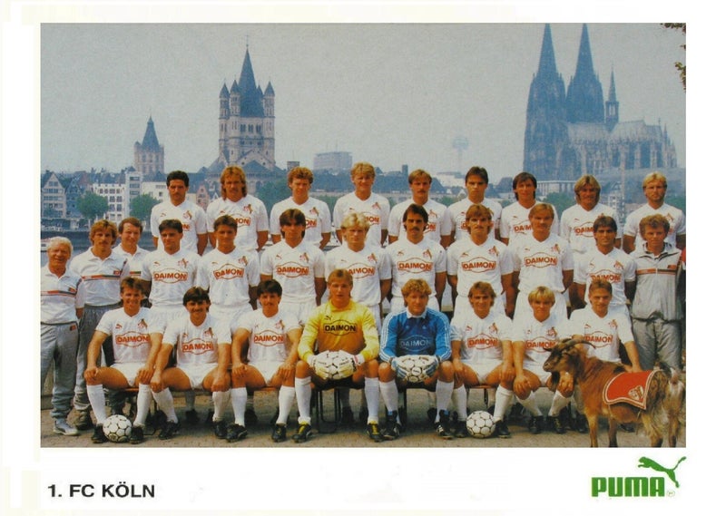 Unten vlnr : Wichterich - K.Allofs - Prestin - Illgner - Schumacher - T.Allofs - Janssen - Hässler - "HennesV"