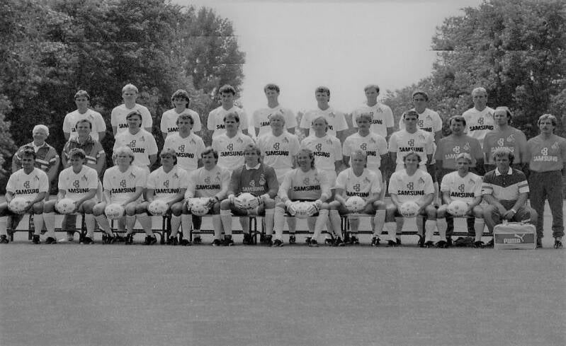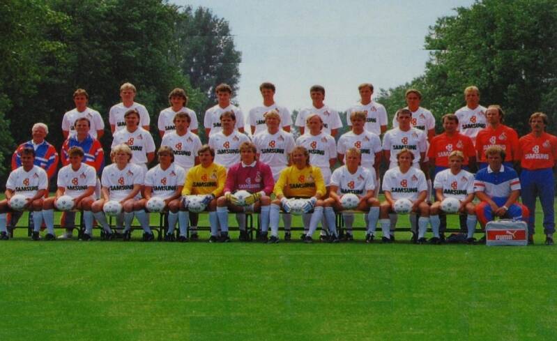 Unten vlnr : Littbarski - Povlsen - Görtz - Götz - Diergardt - Illgner - Kargus - Higl - Heldt - Häßler - Schäfer