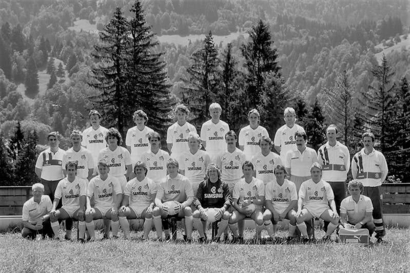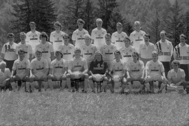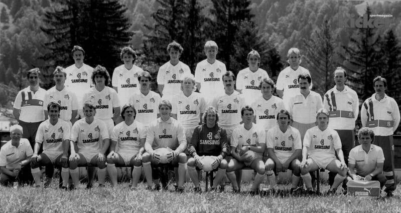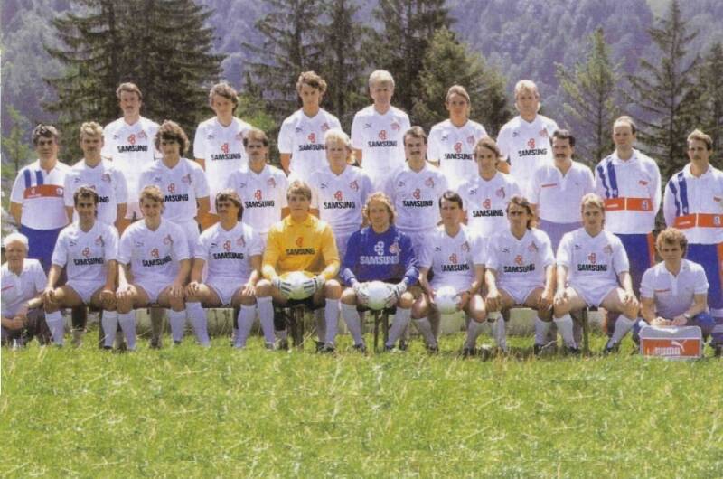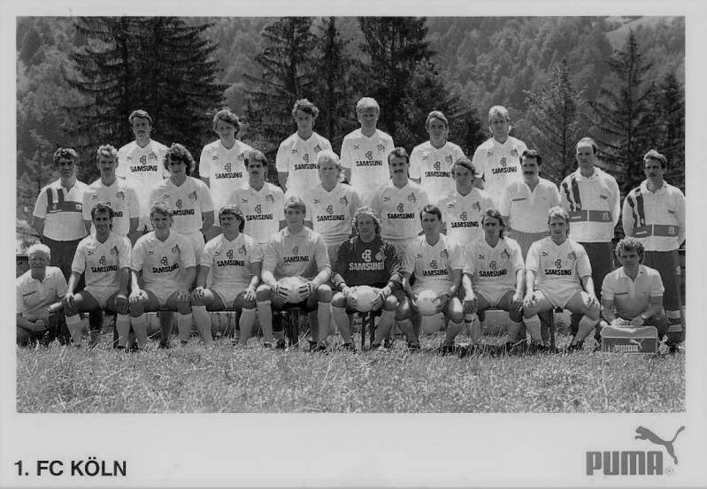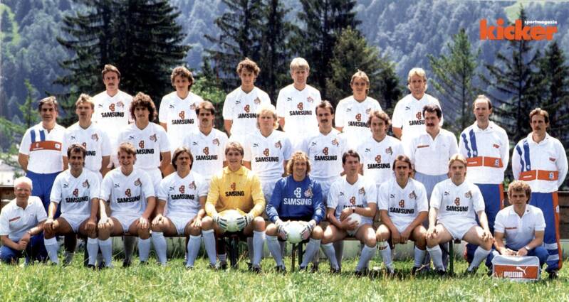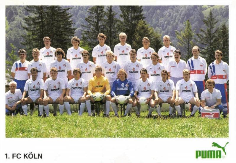 Unten vlnr : Rechmann - Littbarski - Povlsen - Götz - Illgner - Kargus - Engels - T.Allofs - Hässler - Schäfer