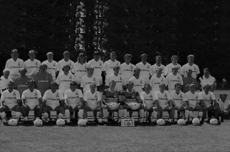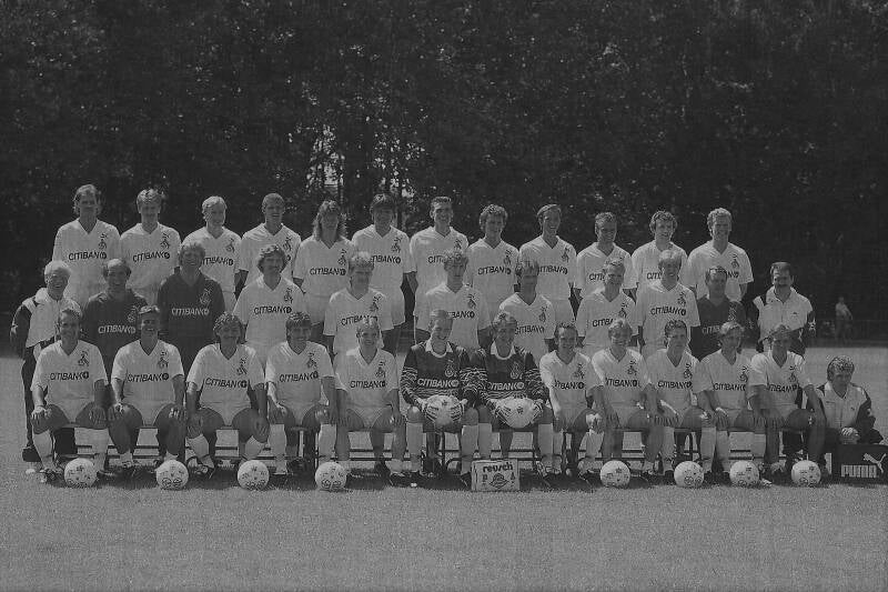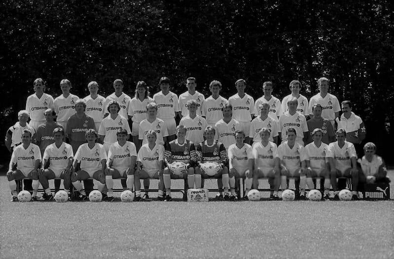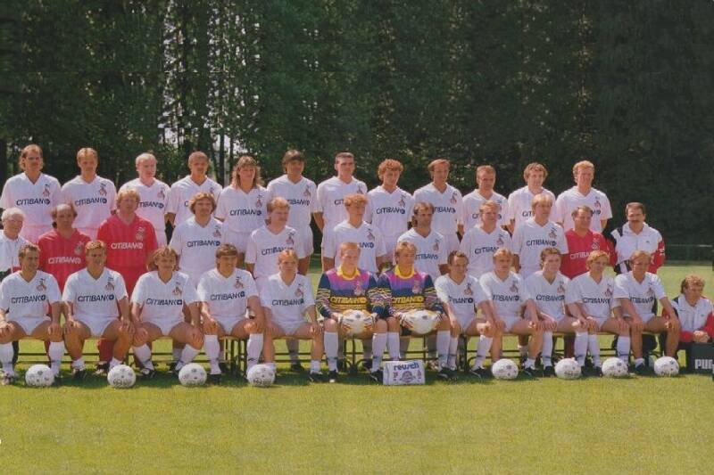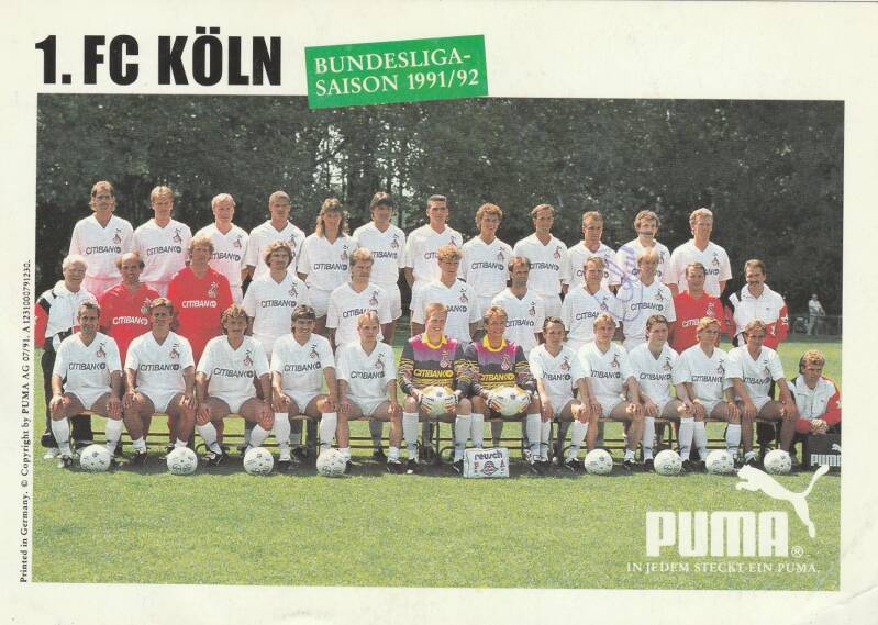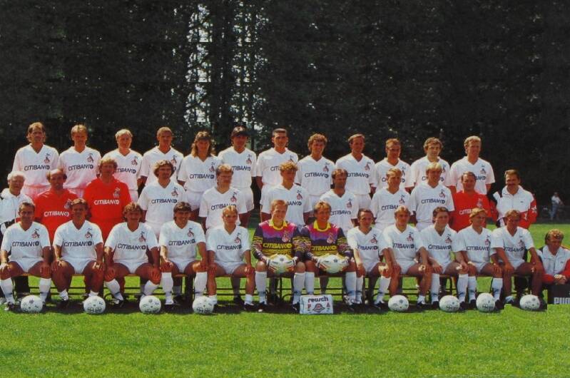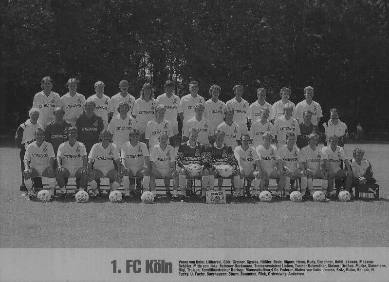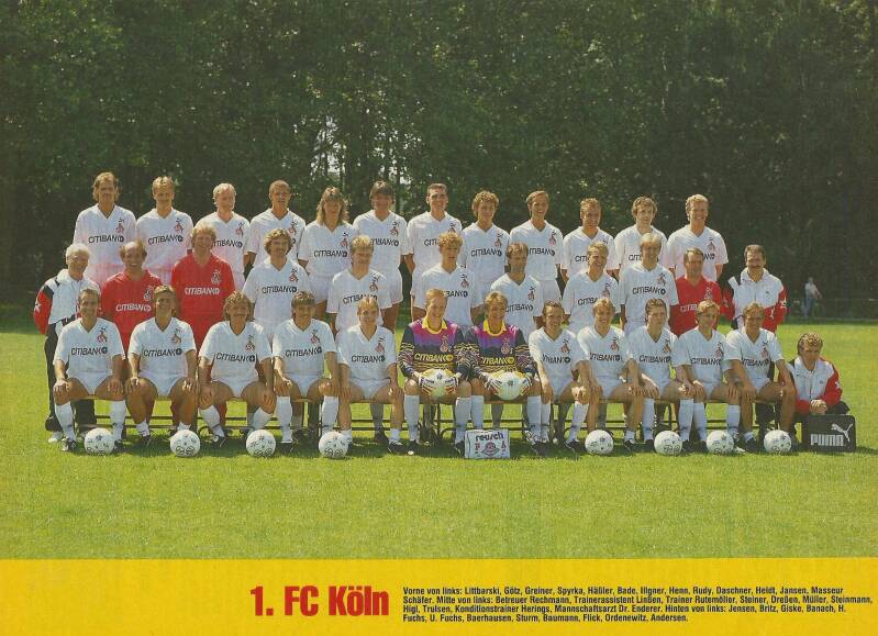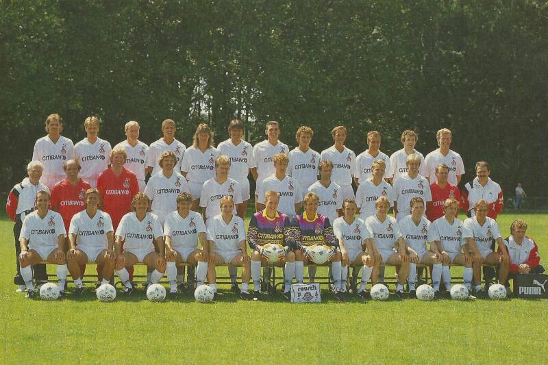 Unten vlnr : Littbarski - Götz - Greiner - Spyrka - Häßler - Bade - Illgner - Henn - Rudy - Daschner - Heldt - Janßen - Schäfer