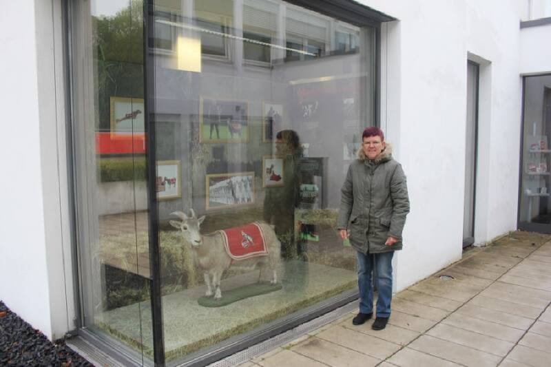 Geissbock ,,Hennes VII" steht wie der Kapitän einer Fußballmannschaft zwischen aufgereihten Geißbockfiguren