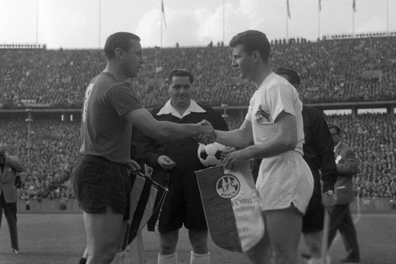 Unser FC - Kapitän Hans Schäfer , dahinter Fritz Ewert und Karl-Heinz Schnellinger