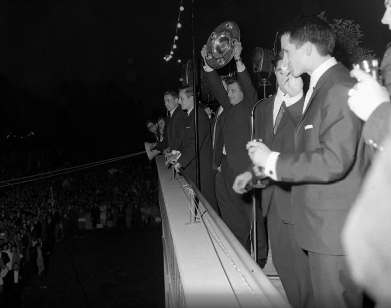 Vlnr : Präsident Franz Kremer mit der Meisterschale , Trainer Zlatko "Tschik" Cajkovski und Hans Schäfer