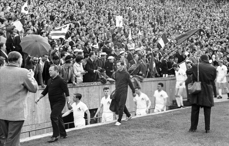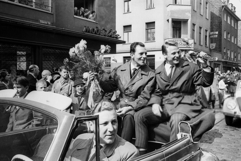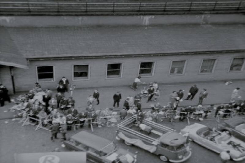 Wartende FC-Fans und Reporter auf den Deutscher Meister 1962