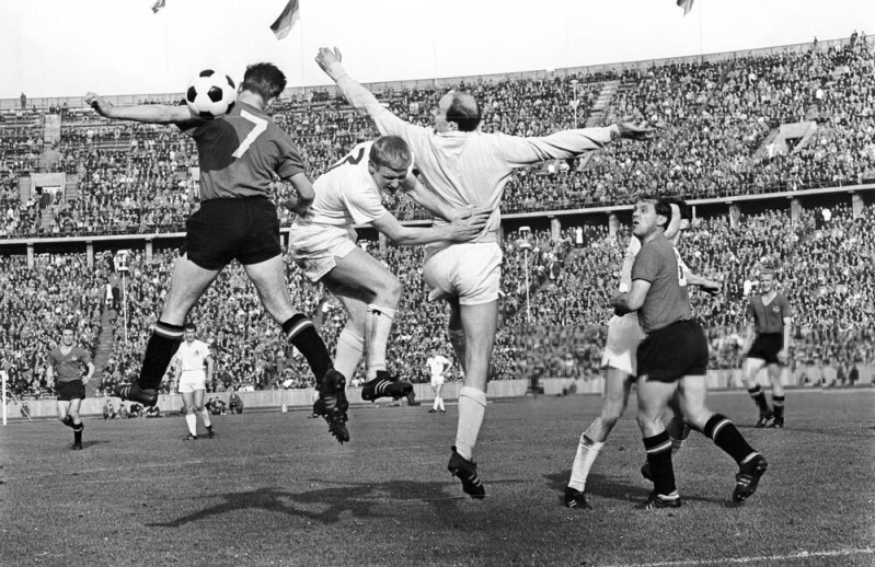 Hans Sturm fliegt hoch fur ein kopfball , daneben Karl-Heinz Thielen