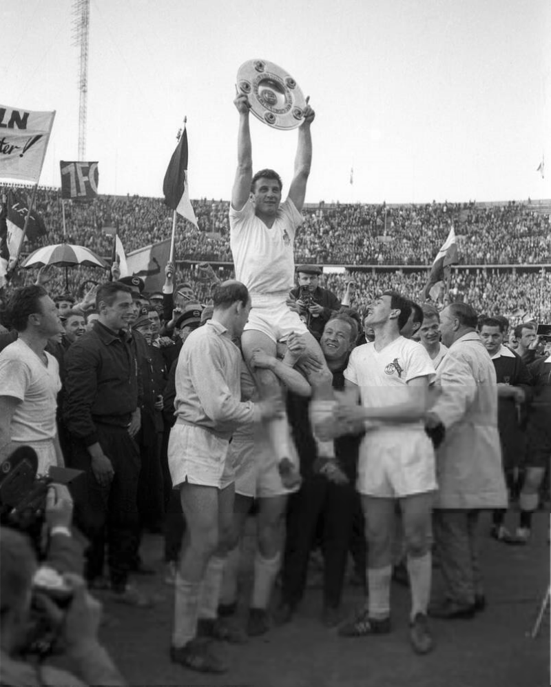 Hans Schäfer hält die Meisterschale hoch , daneben Fritz Pott