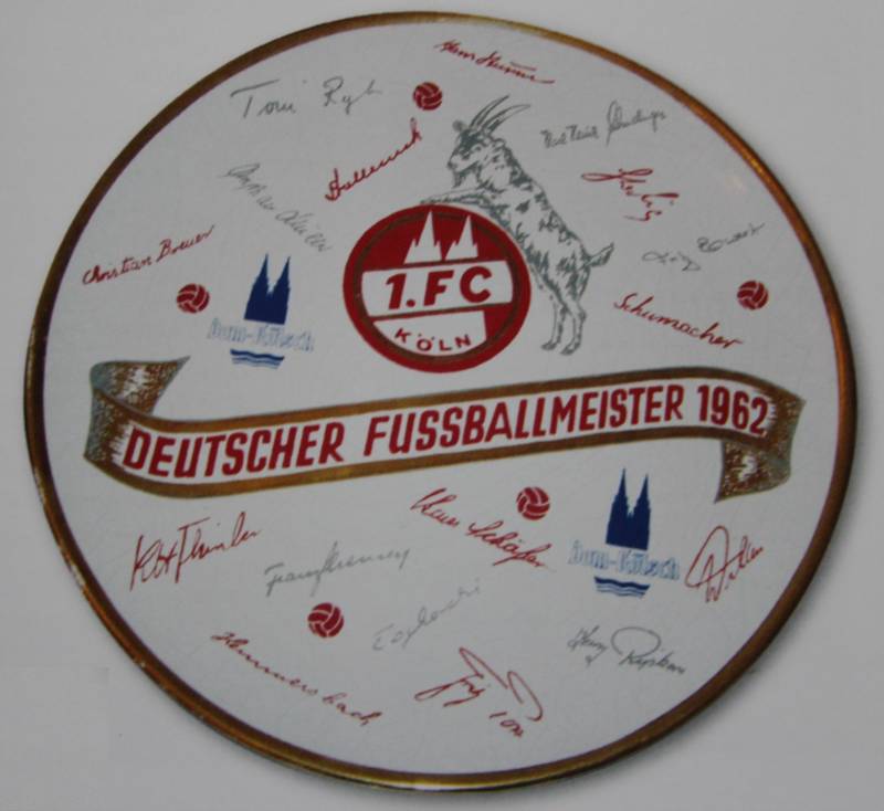 Hans Schäfer hält die Schale hoch , neben ihm Fritz Pott , rechts unten : Präsident Franz Kremer