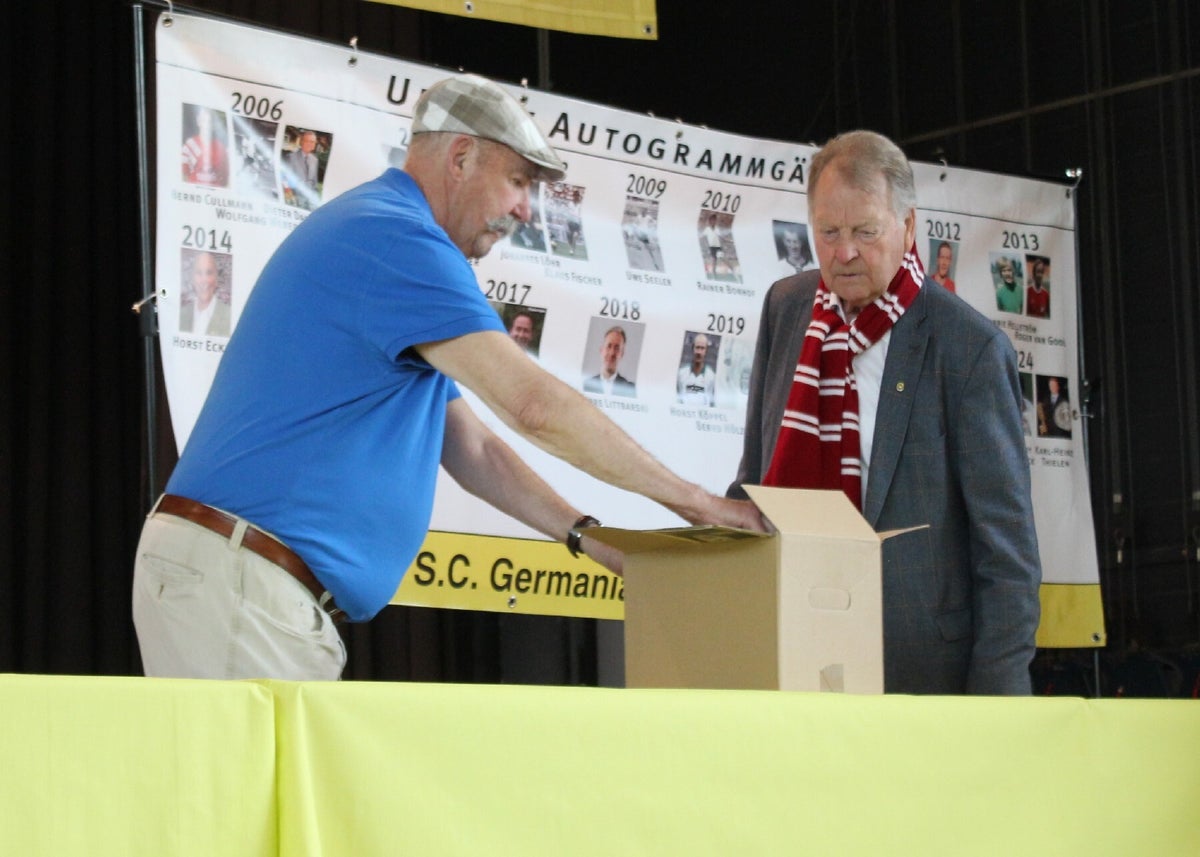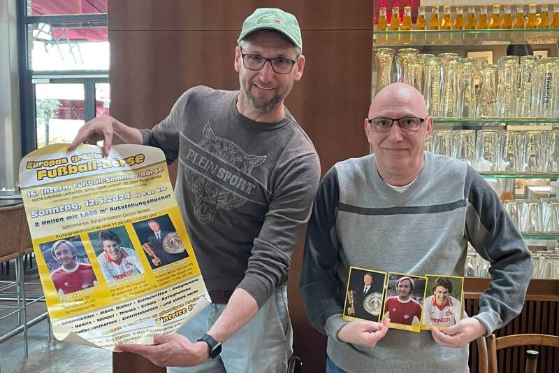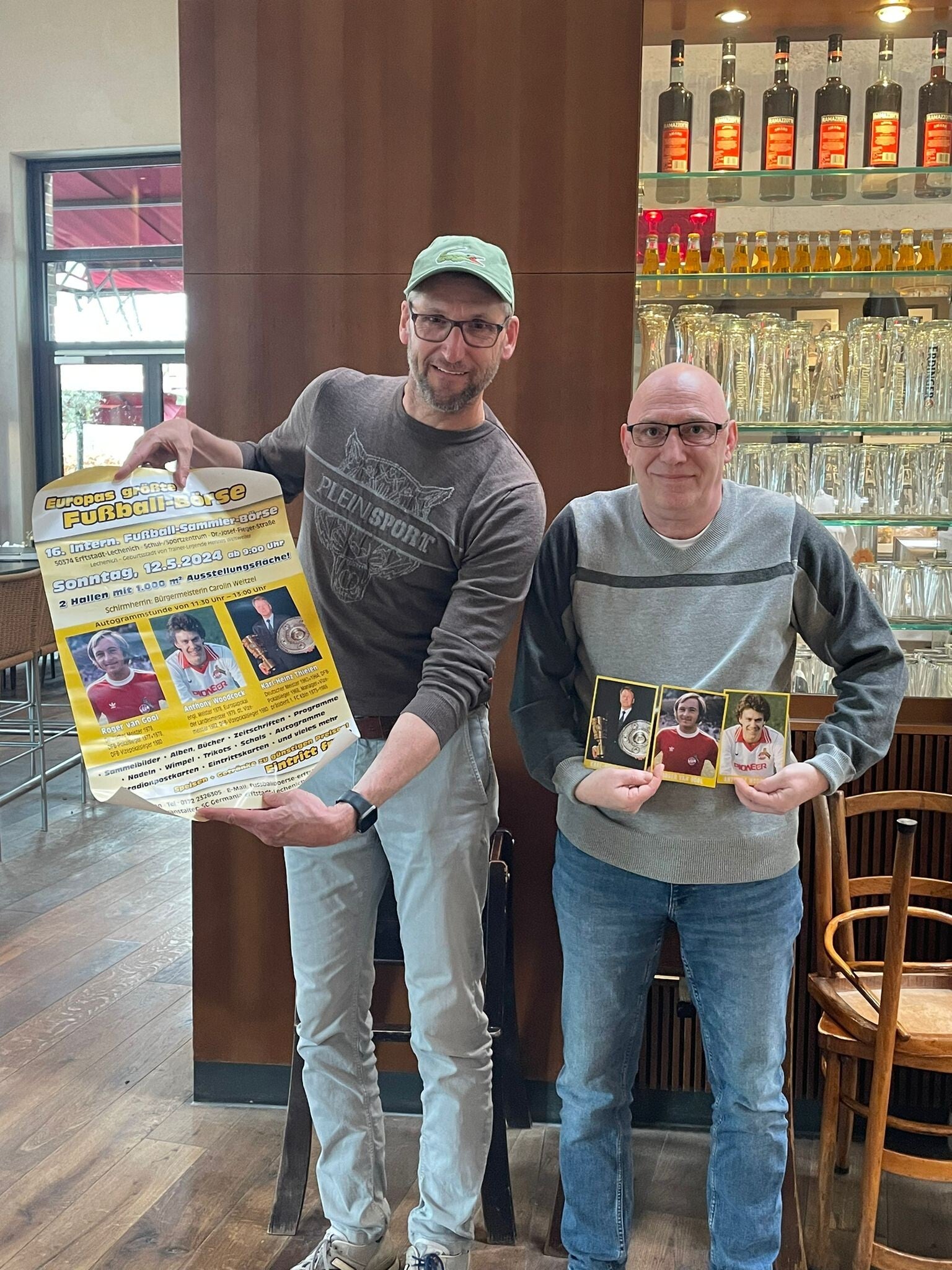Organisator Ralph Hoppen (links) posierend mit dem Poster der Sammlerbörse und ich mit die Autogrammkarten für die Autogrammstunde der Spieler
