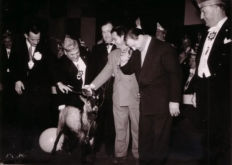 1949 gebar die sie einen Bock. Nur ein Jahr später fand auf der zweiten FC-Karnevalssitzung im Williamsbau die Hennes-Tradition ihren Ursprung.