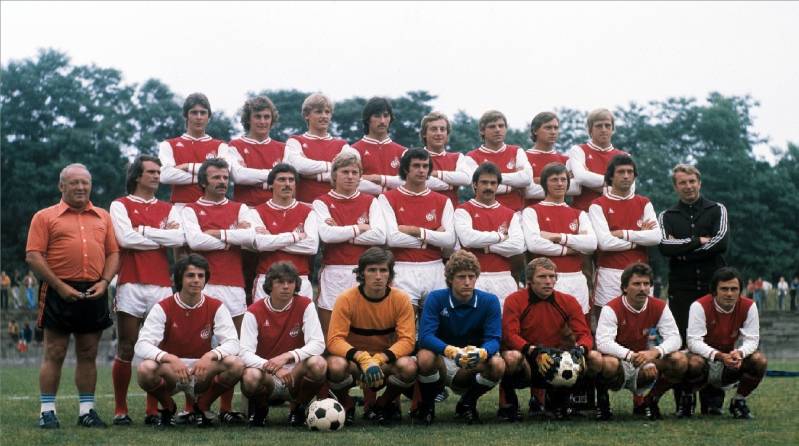 Oben vlnr : Trainer Cajkovski - Overath - Schumacher - Cullmann - Strack - Neumann - G. Weber - Müller - Zimmermann - W.Weber - Hein - Brücken - Herings
